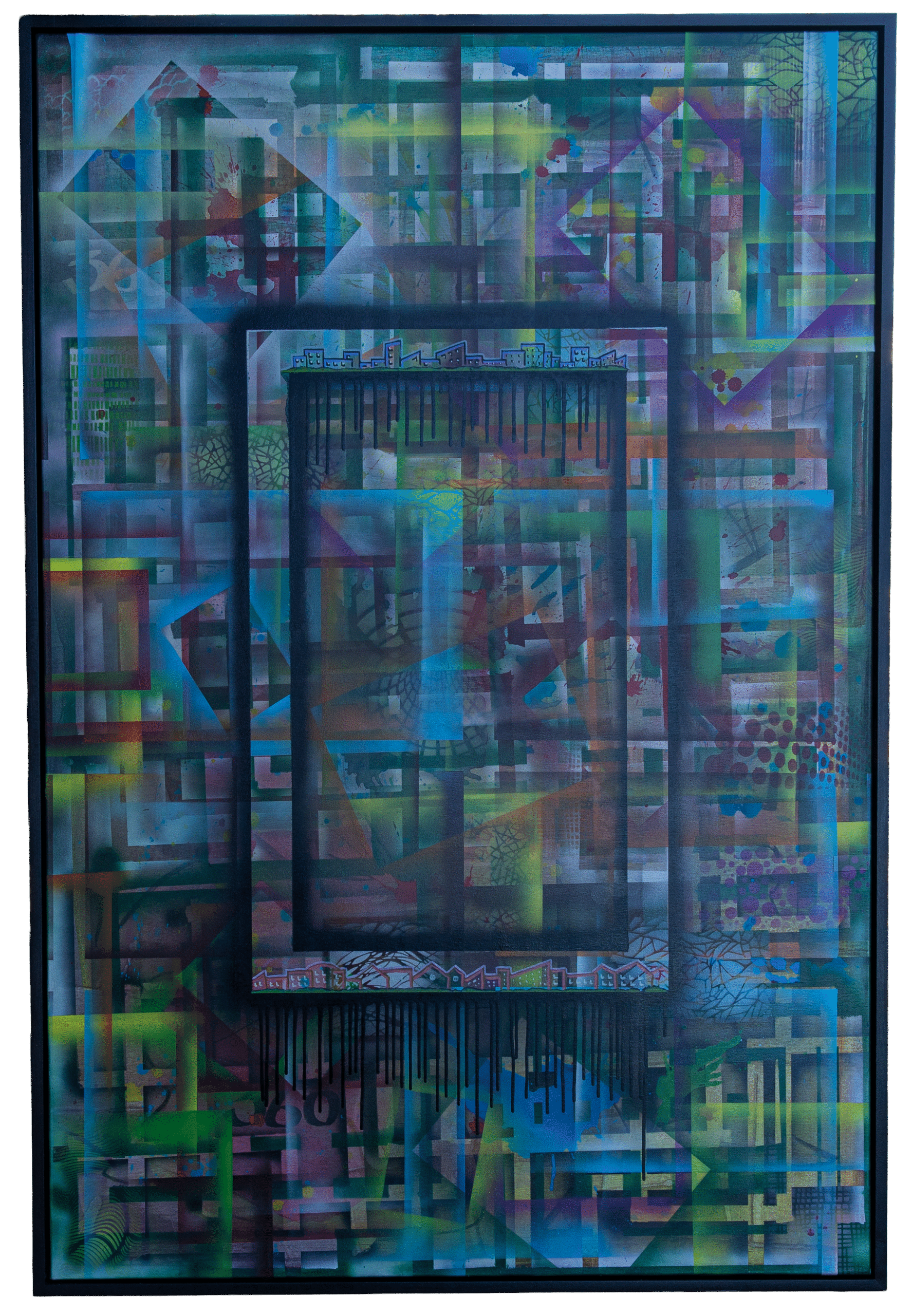 The central square-within-a-square pulls the viewer inward, while elements like dripping black paint, pixelated textures, and faint cityscapes blur the boundaries between the virtual and physical, order and entropy. Echoes of transparency and reflection suggest movement through time — or a constant return to origin.