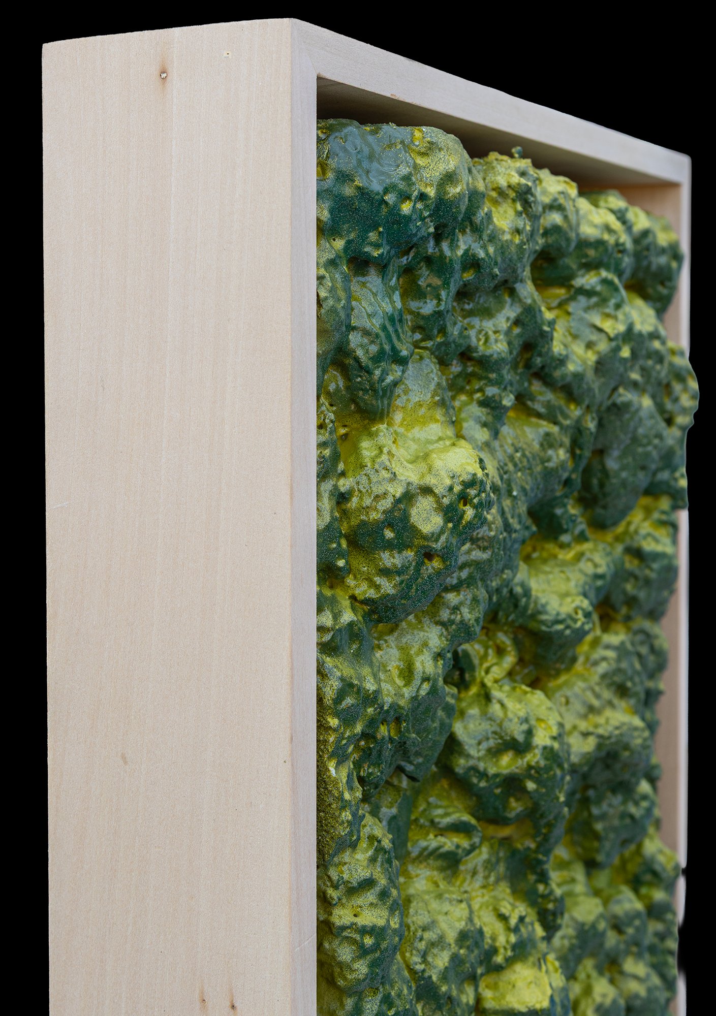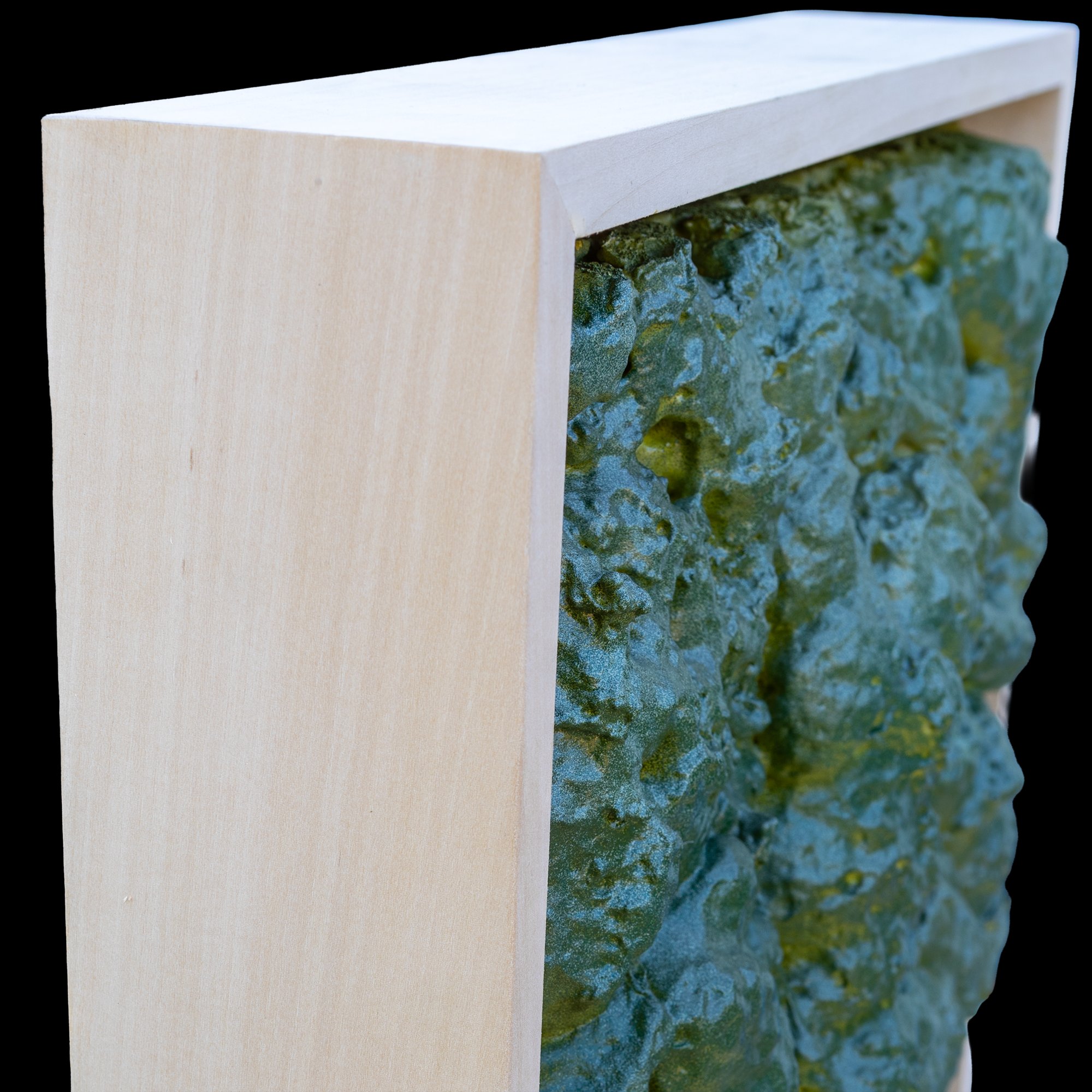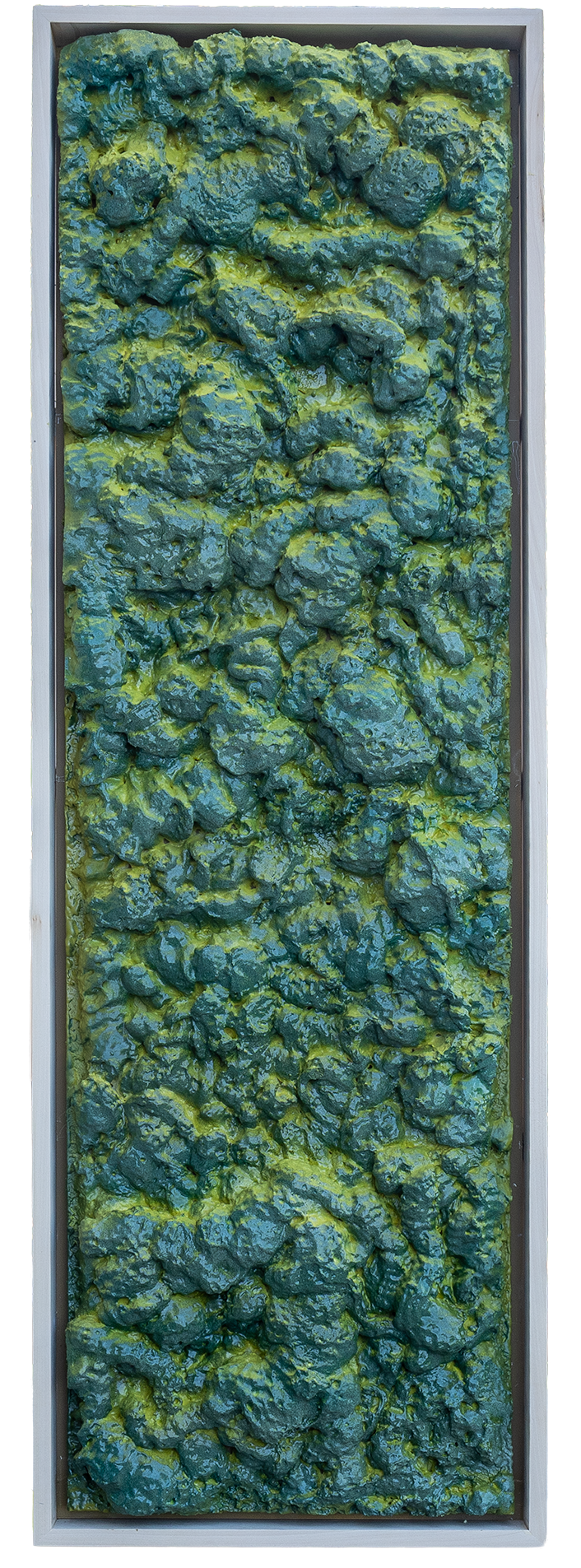 Is a vertical, textured homage to the raw, untamed spirit of the world’s most vital rainforest. The surface is densely layered with organic bulges and terrain-like buildup, painted in vibrant hues of jungle green and deep cyan — capturing the rich biodiversity and ever-changing surface of the Amazon basin.