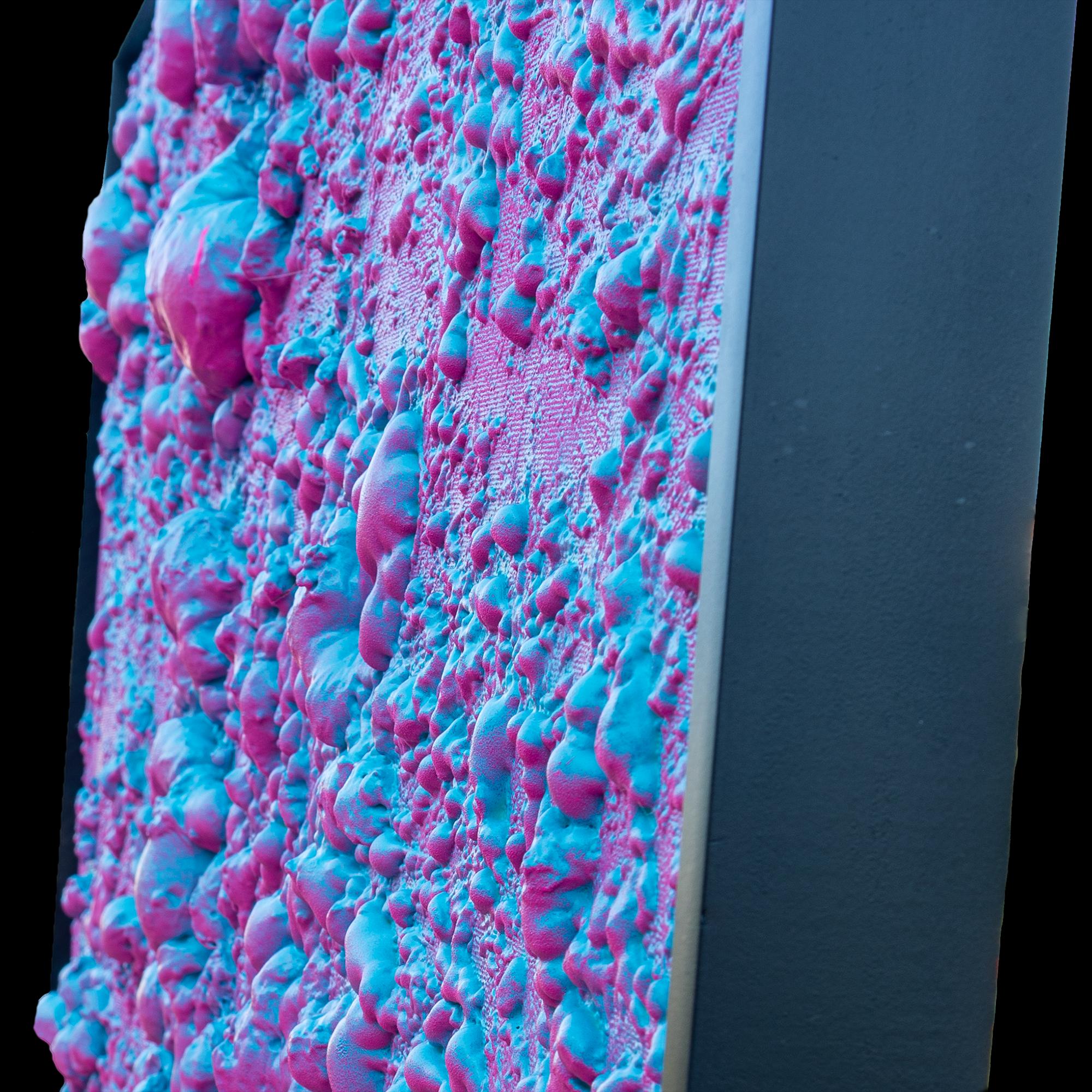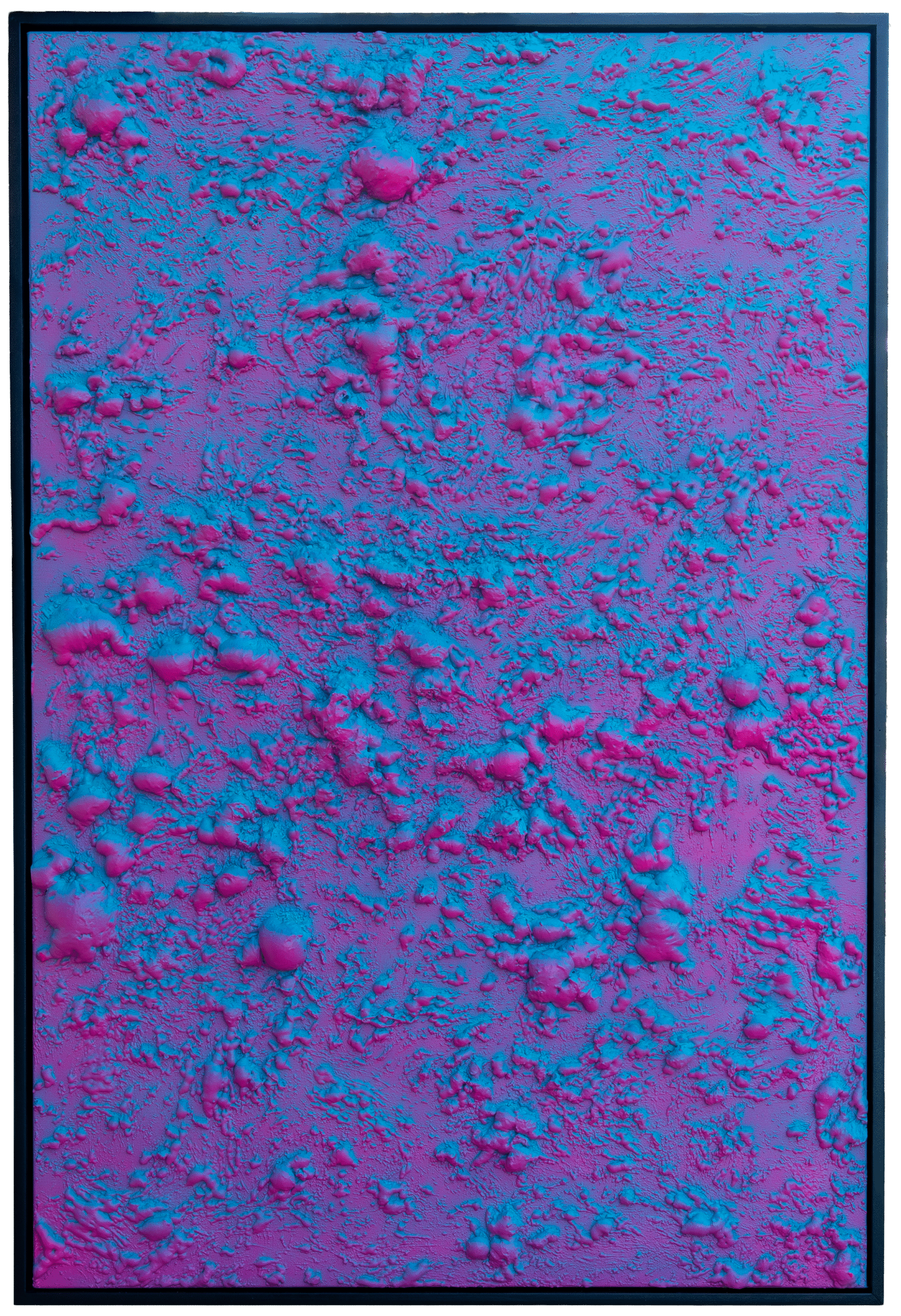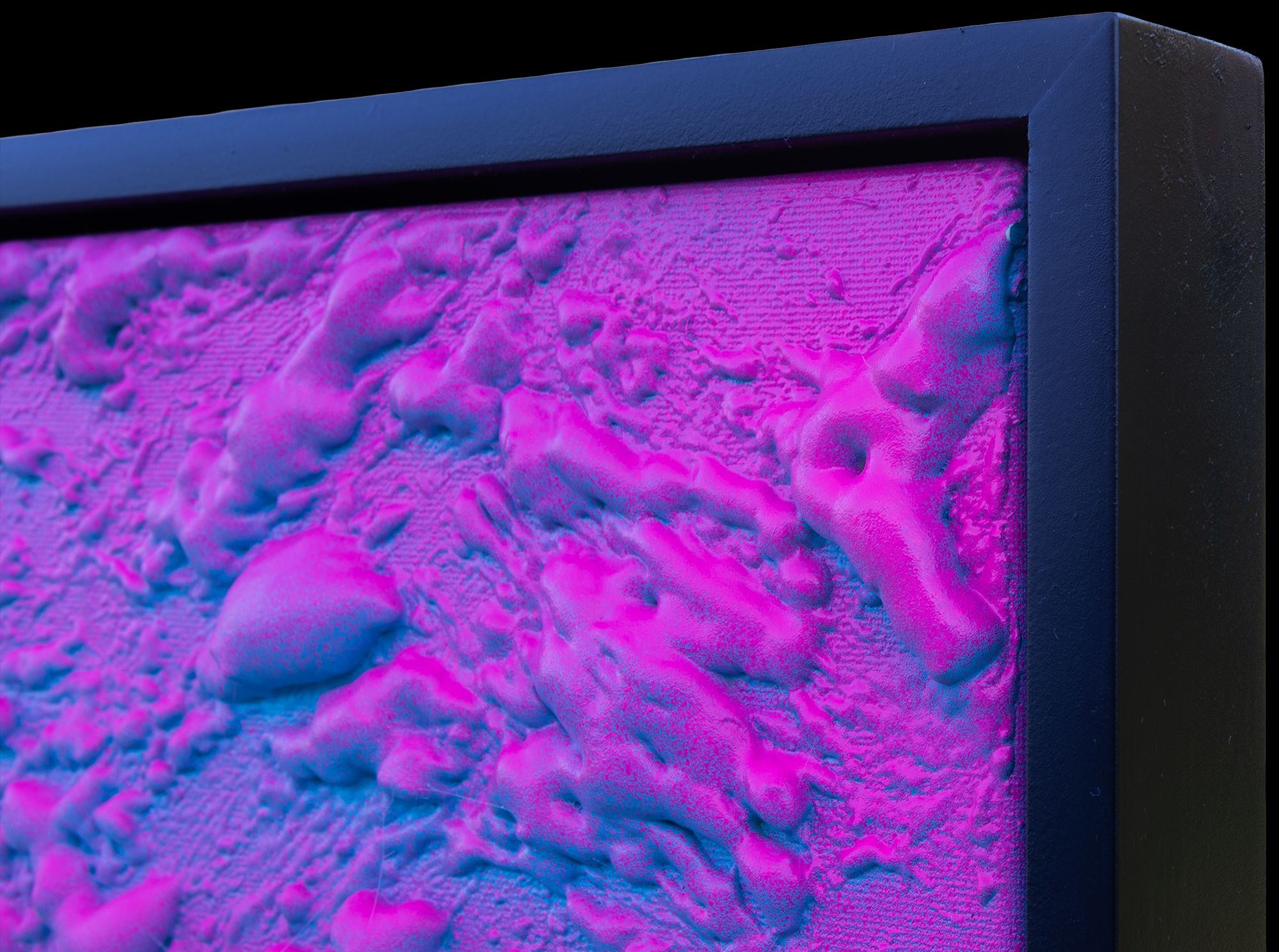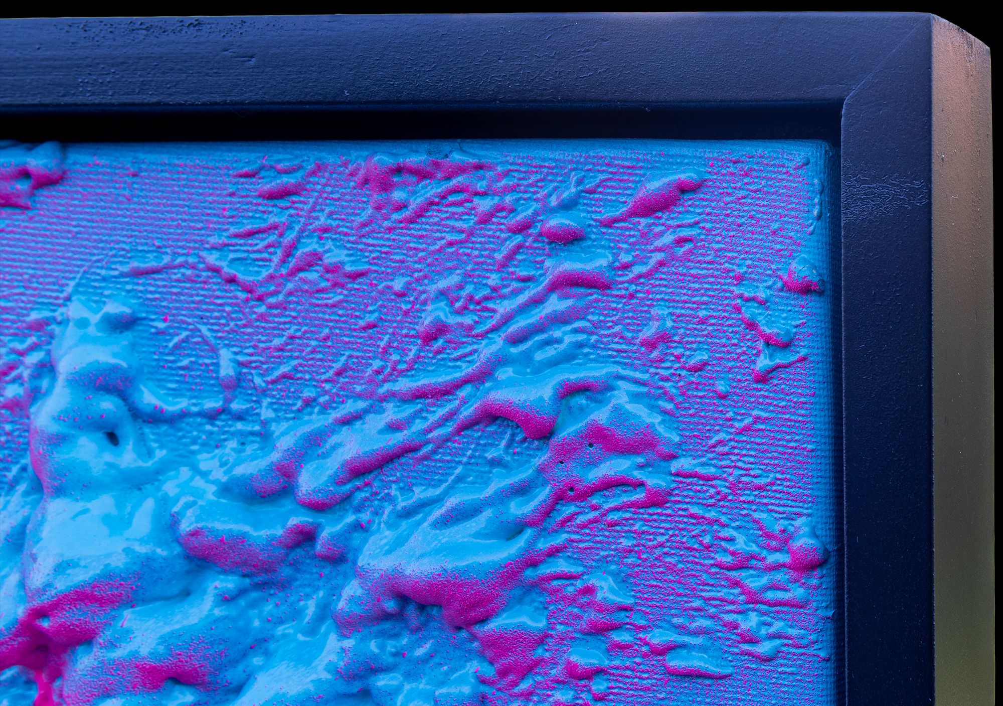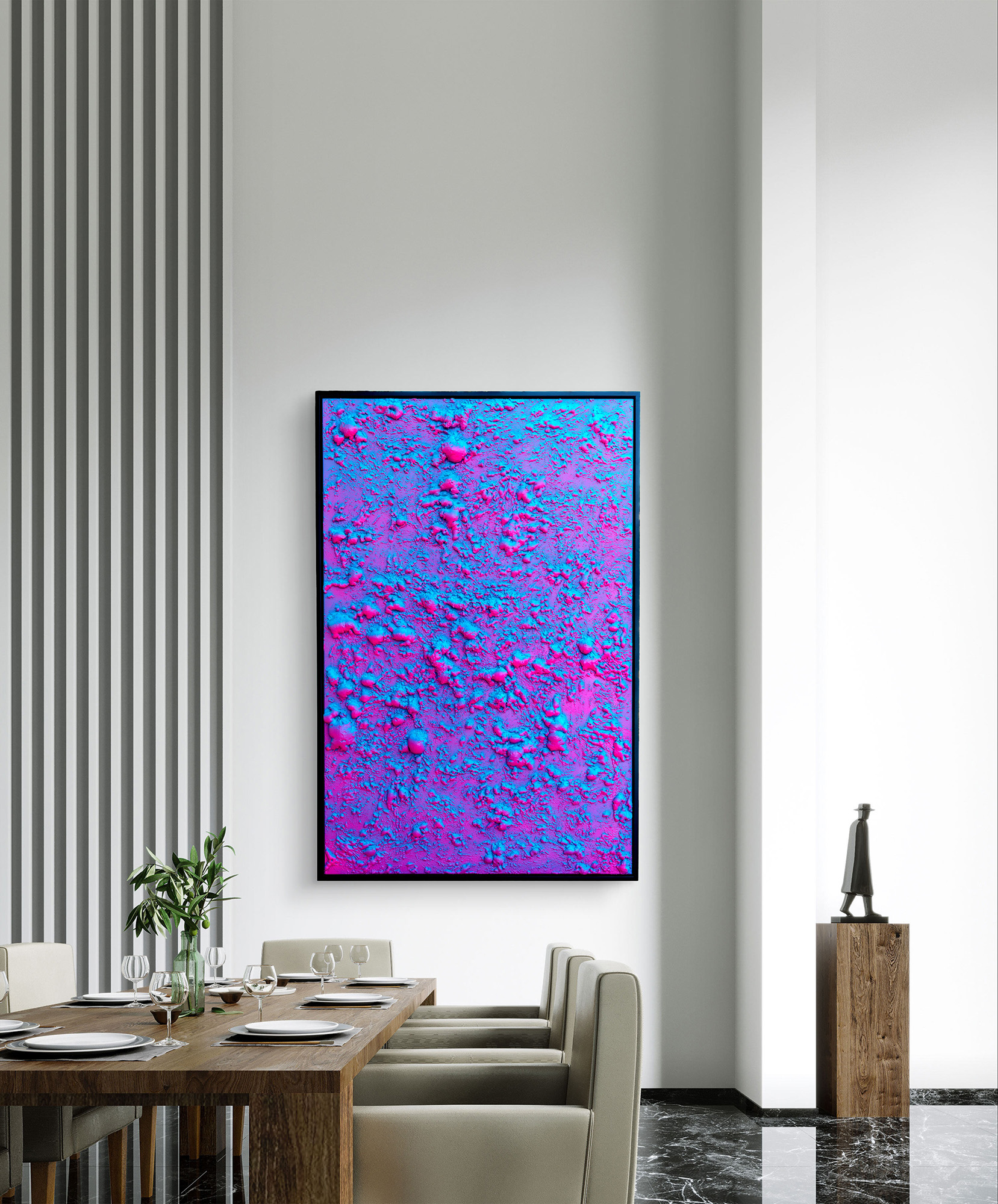 Is a visceral encounter between colour and form — raw, primal, and electric. Dominated by a fierce interplay of deep magenta and charged cyan, the surface is thick with eruptions and craters, like a terrain shaped by force and instinct. The texture feels alive, as if something beneath the surface is trying to break free. The colours pulse with unnatural intensity — neon yet organic, beautiful yet unsettling. This duality mirrors the nature of the beast itself: seductive and wild, powerful and chaotic. There’s no single focal point; instead, the entire surface vibrates with restless energy, pulling the viewer into its untamed momentum. Beast isn’t just a painting — it’s an unleashed presence, a confrontation with raw emotion and unfiltered creation.