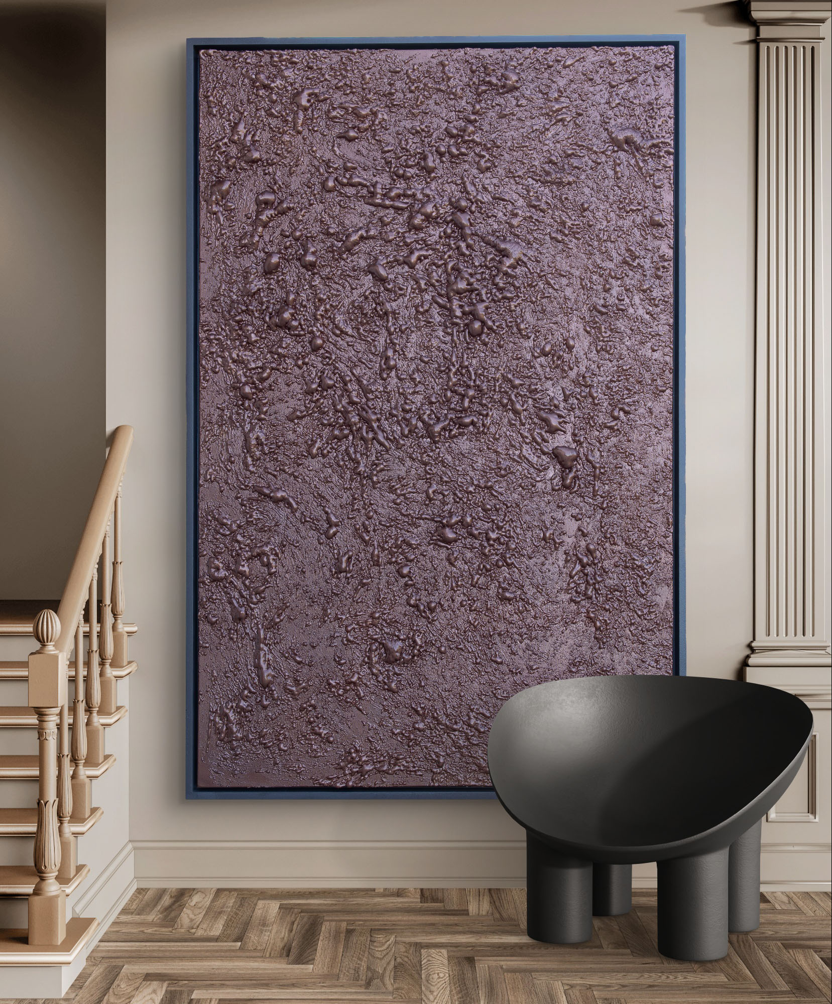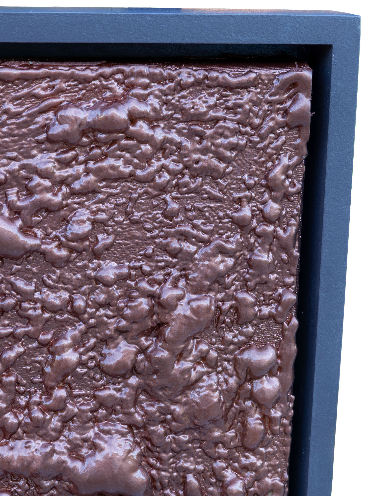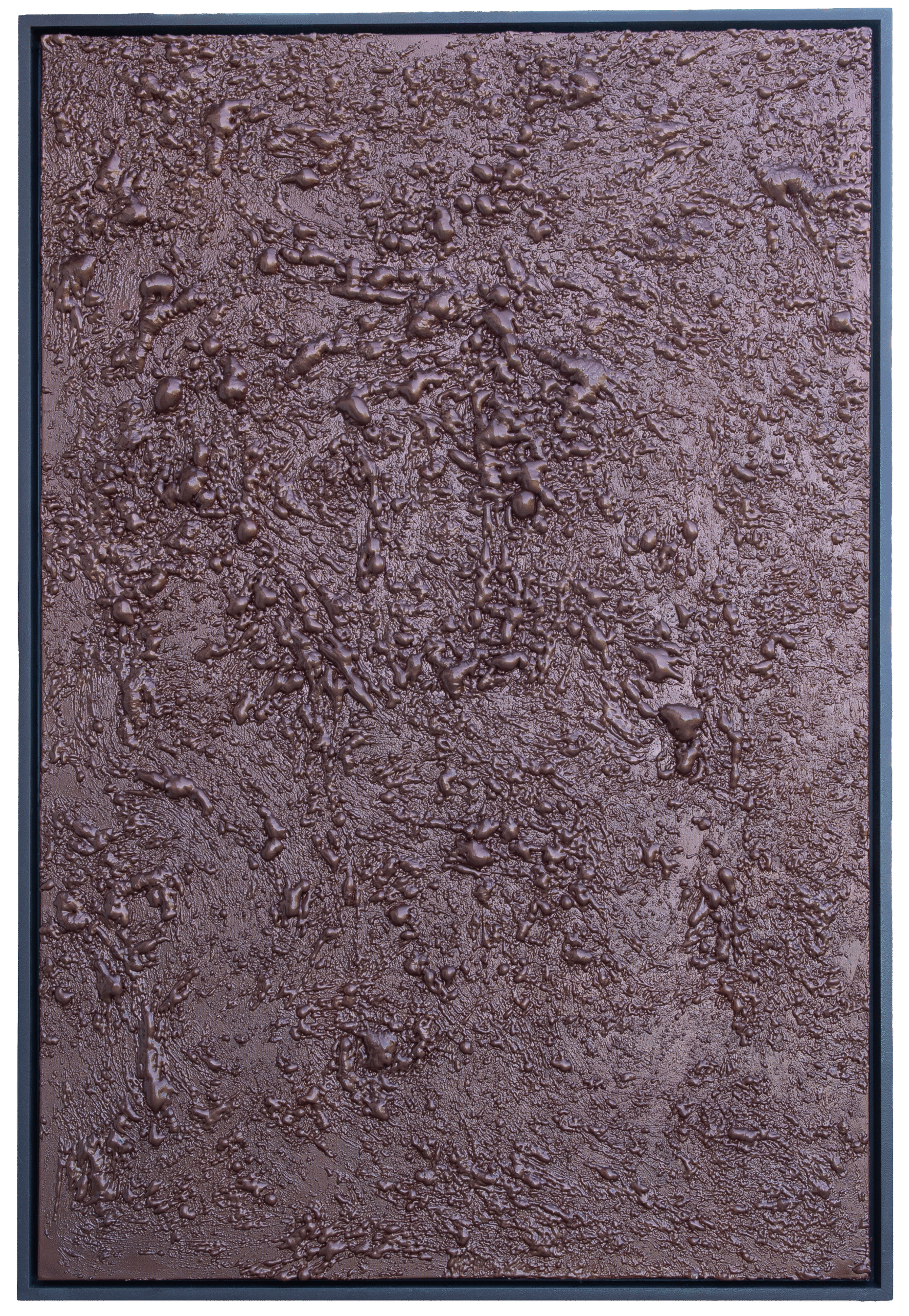 Is a richly tactile and monochromatic work that evokes the timeless strength of forged metal and the natural erosion of surfaces touched by time. With its earthy metallic sheen and cratered, pitted texture, the painting resembles an ancient artifact or a newly discovered planetary surface — dense with memory, silent but alive.