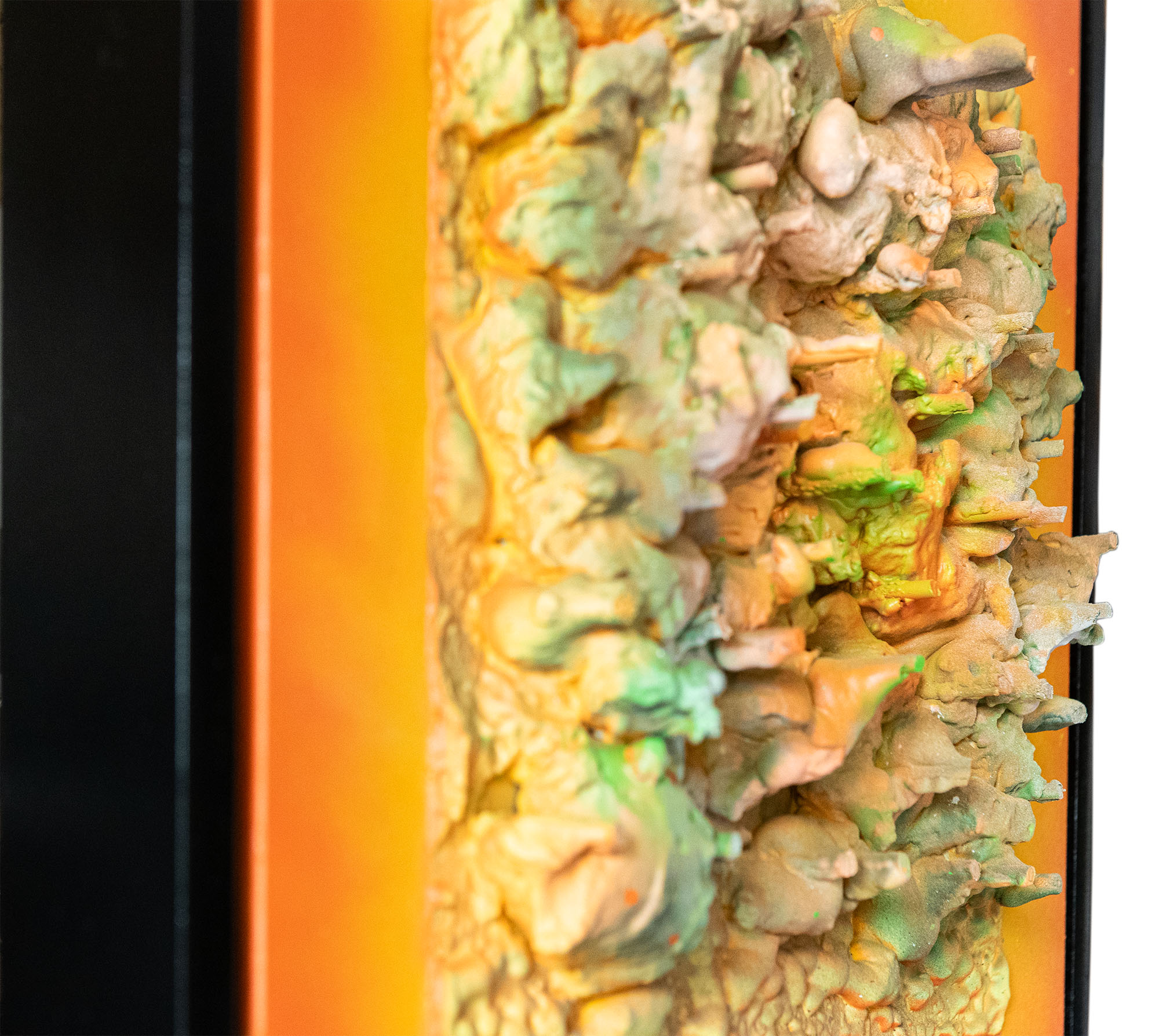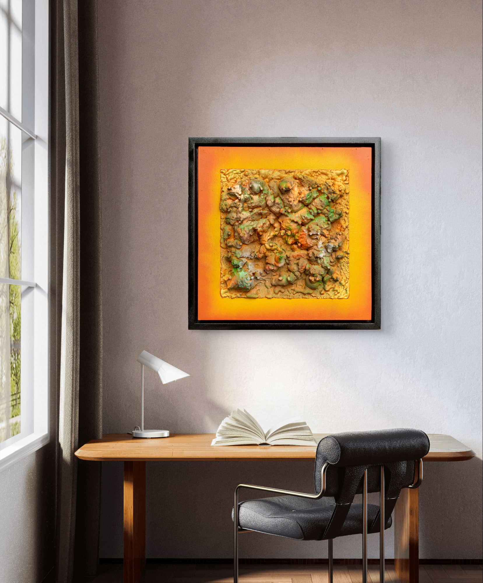 Devil’s Welly erupts with earthy chaos—an unruly, bubbling terrain that appears scorched from below. The highly textured surface, resembling molten mud or volcanic clay, is pocked with crater-like forms and nodules that hint at something festering or brewing underneath. Shades of burnt orange, mossy green, and ash-grey clash and blend across the surface, giving the impression of a cursed land or the inside of a boiling cauldron.