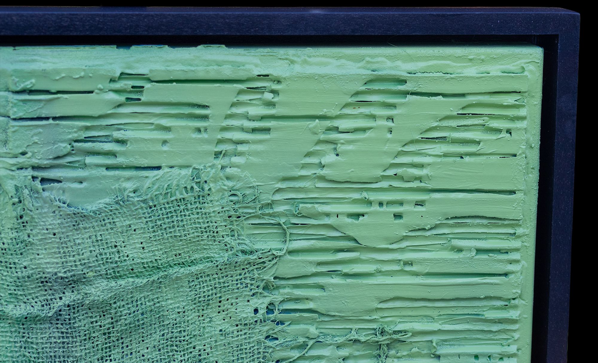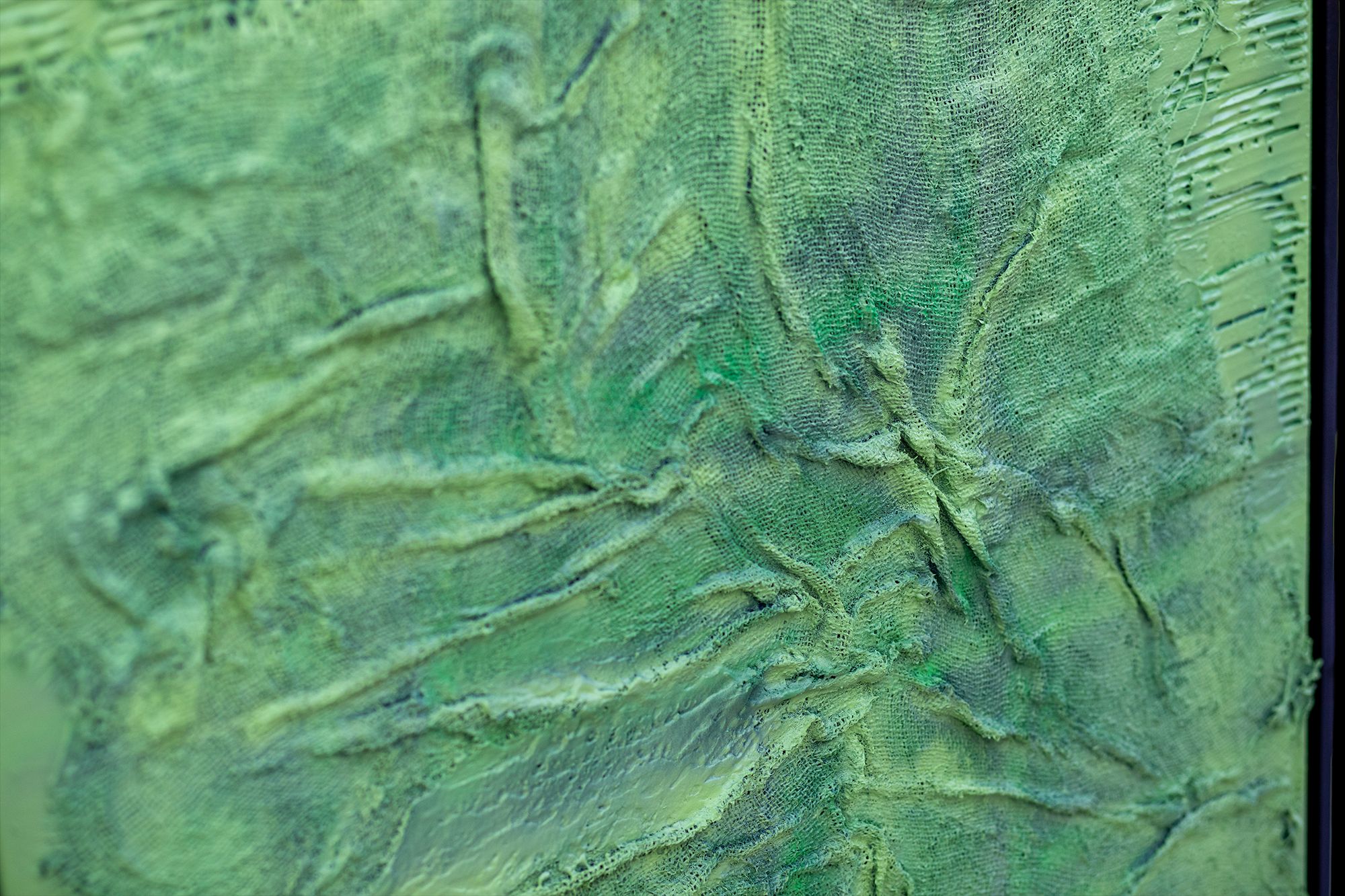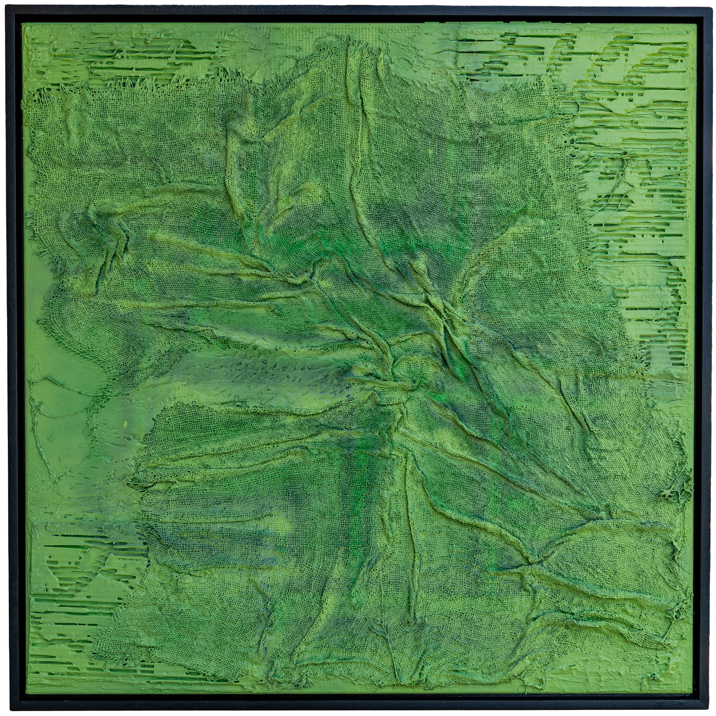 Is a vibrant, tactile homage to nature’s quiet power and regenerative force. The canvas is alive with layers of green — from luminous lime to forest shadows — weaving together like roots, rivers, or the folds of leaves in motion. Its dense texture creates a topographical effect, as though you’re looking at an aerial view of a living, breathing landscape.