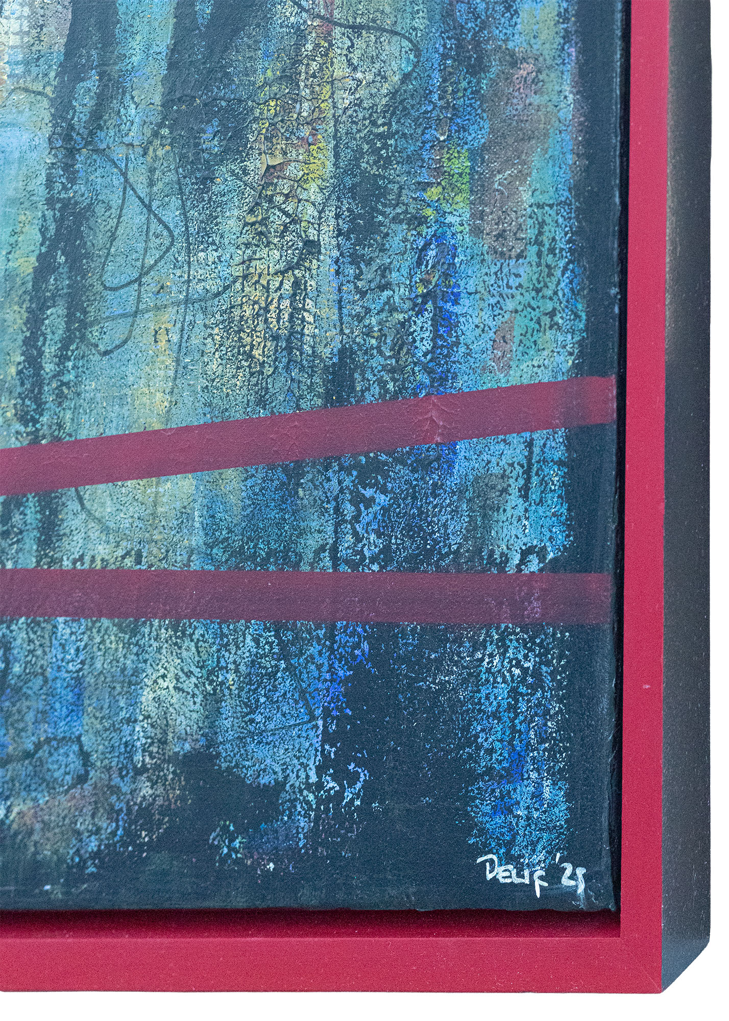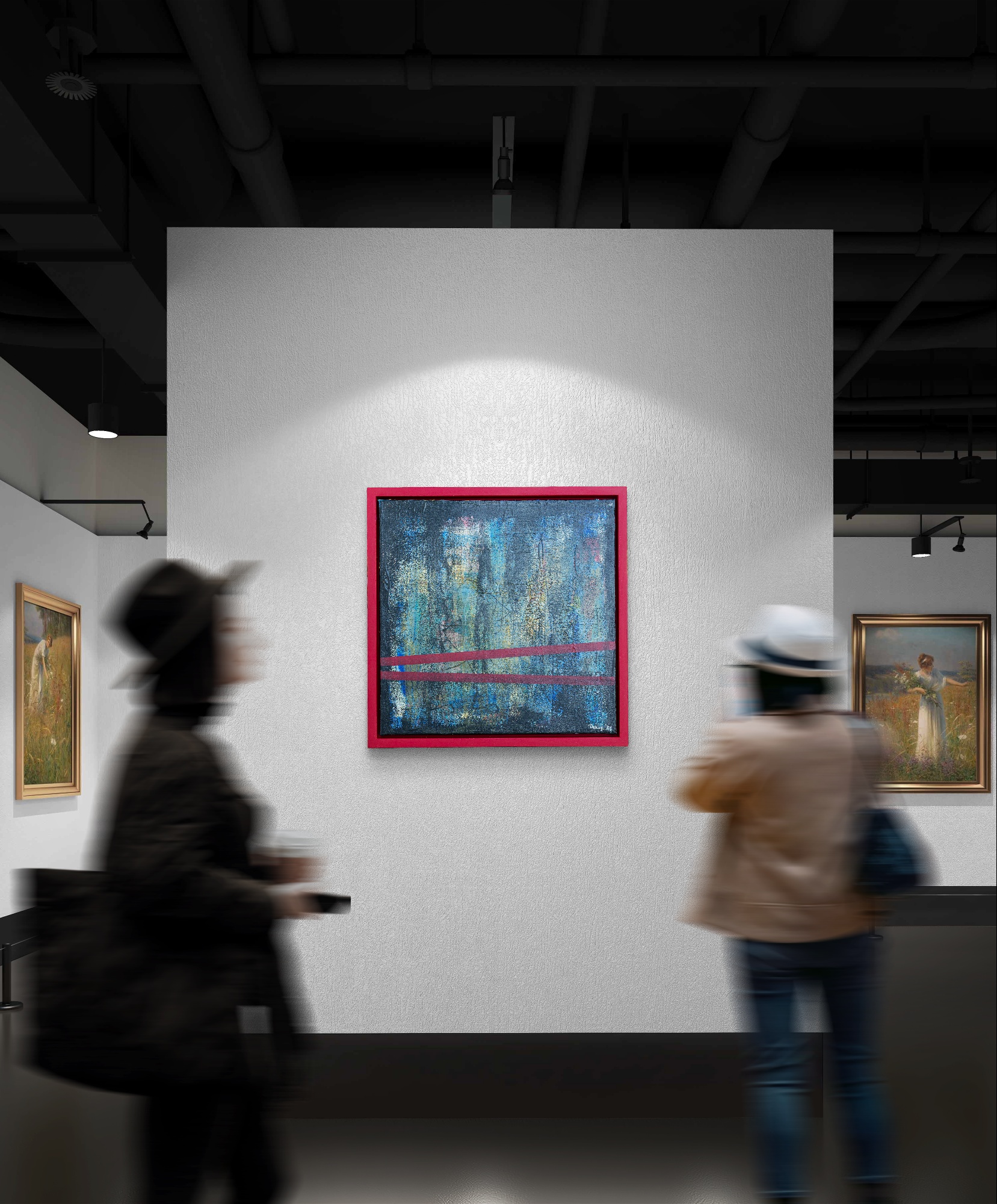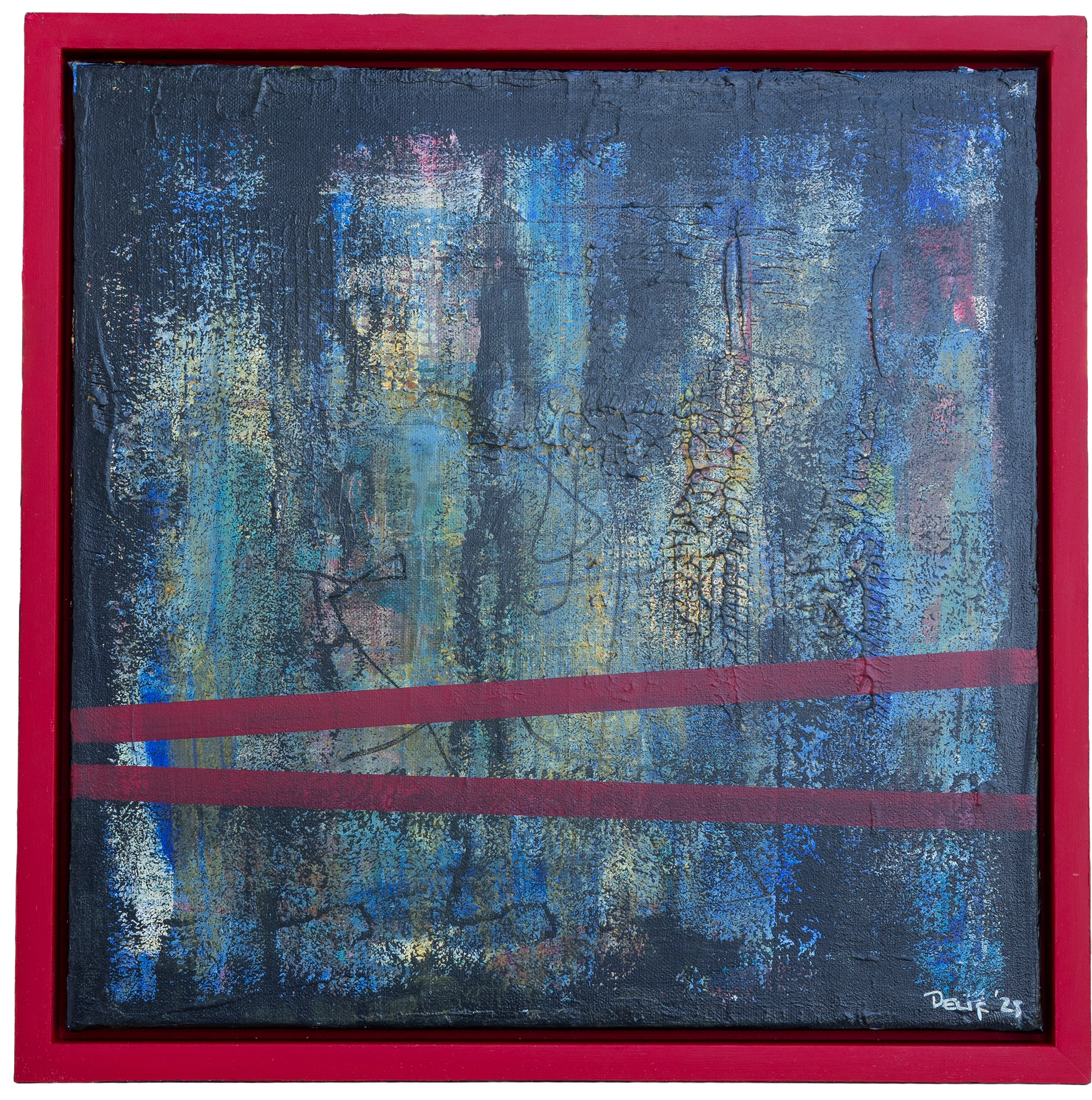 This painting radiates contrast and controlled energy. A deep, textured field of midnight blues, greys, and cool yellows forms the background — filled with layered strokes, drips, and subtle surface cracks. The abstract composition feels moody and introspective, almost like a nocturnal cityscape seen through fog or rain. Two bold diagonal red stripes cut through the composition with purpose. They add a dynamic sense of tension — like barriers, signals, or suppressed urgency — and instantly draw the viewer’s eye. Framed in a striking red border, the piece gains even more intensity and definition.