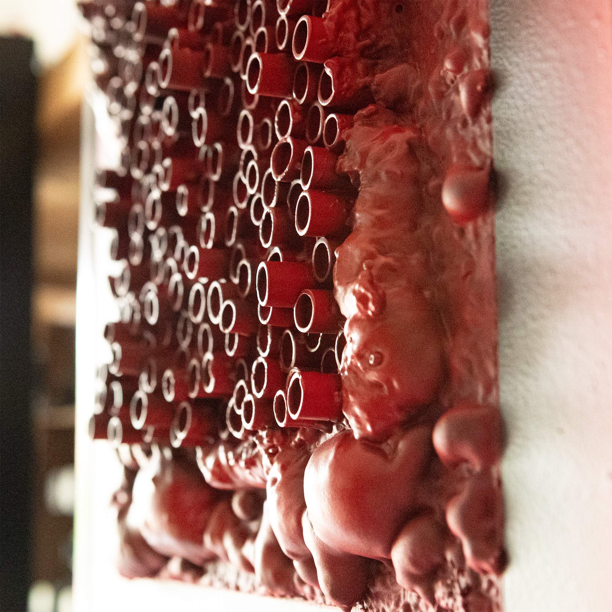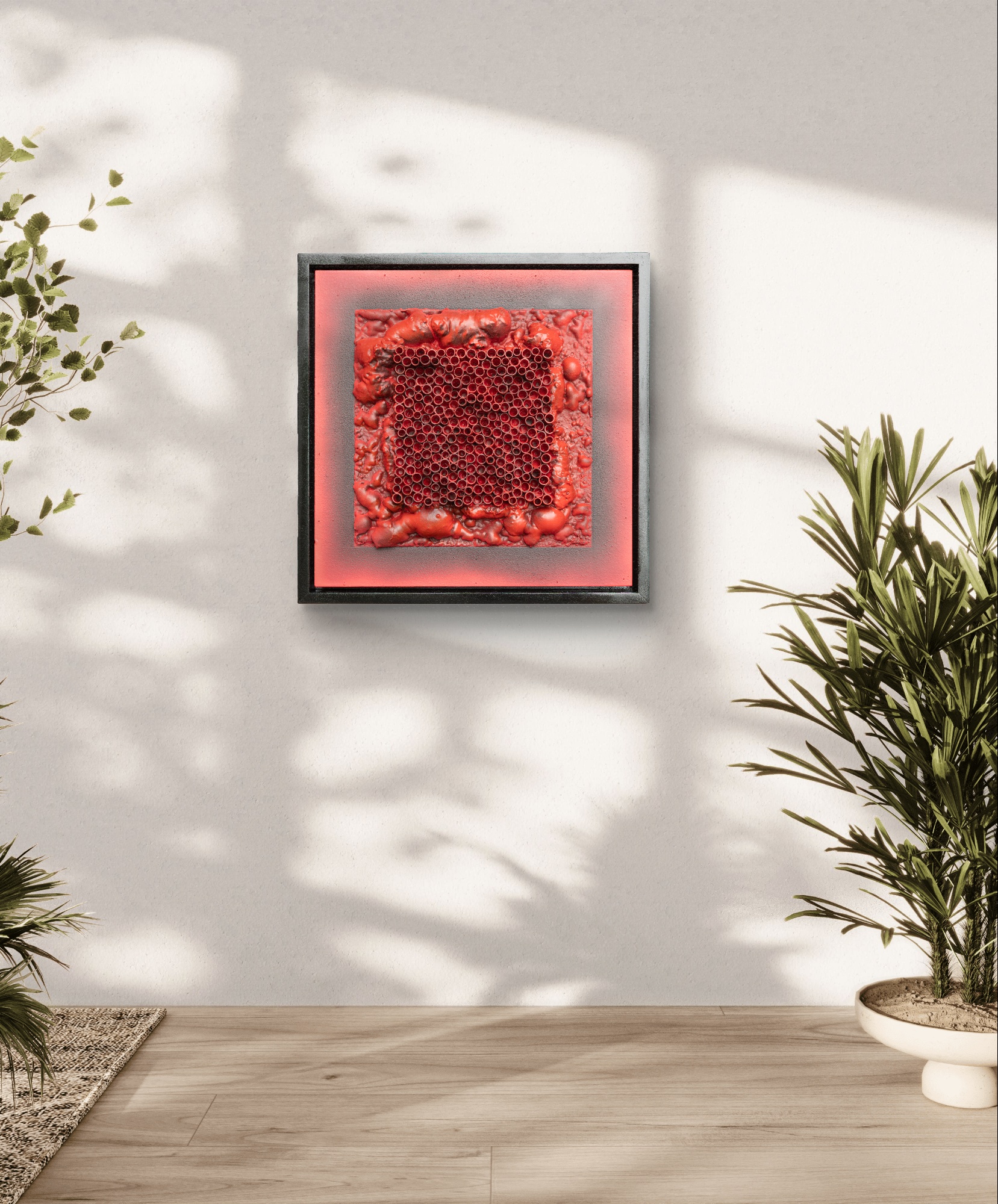 “Smoking Guns” radiates intense energy through its geometric structure and visceral textures. At its core, a grid of red-toned cylindrical forms evokes a honeycomb or ammunition chamber—suggesting both the beauty of natural repetition and the threat of mechanical force. The central motif is surrounded by molten, sculptural forms, metallic and organic, as if pressure and fire have reshaped the surface. The outer edges fade into a glowing, smoky gradient—like the last breath of heat after an explosion.