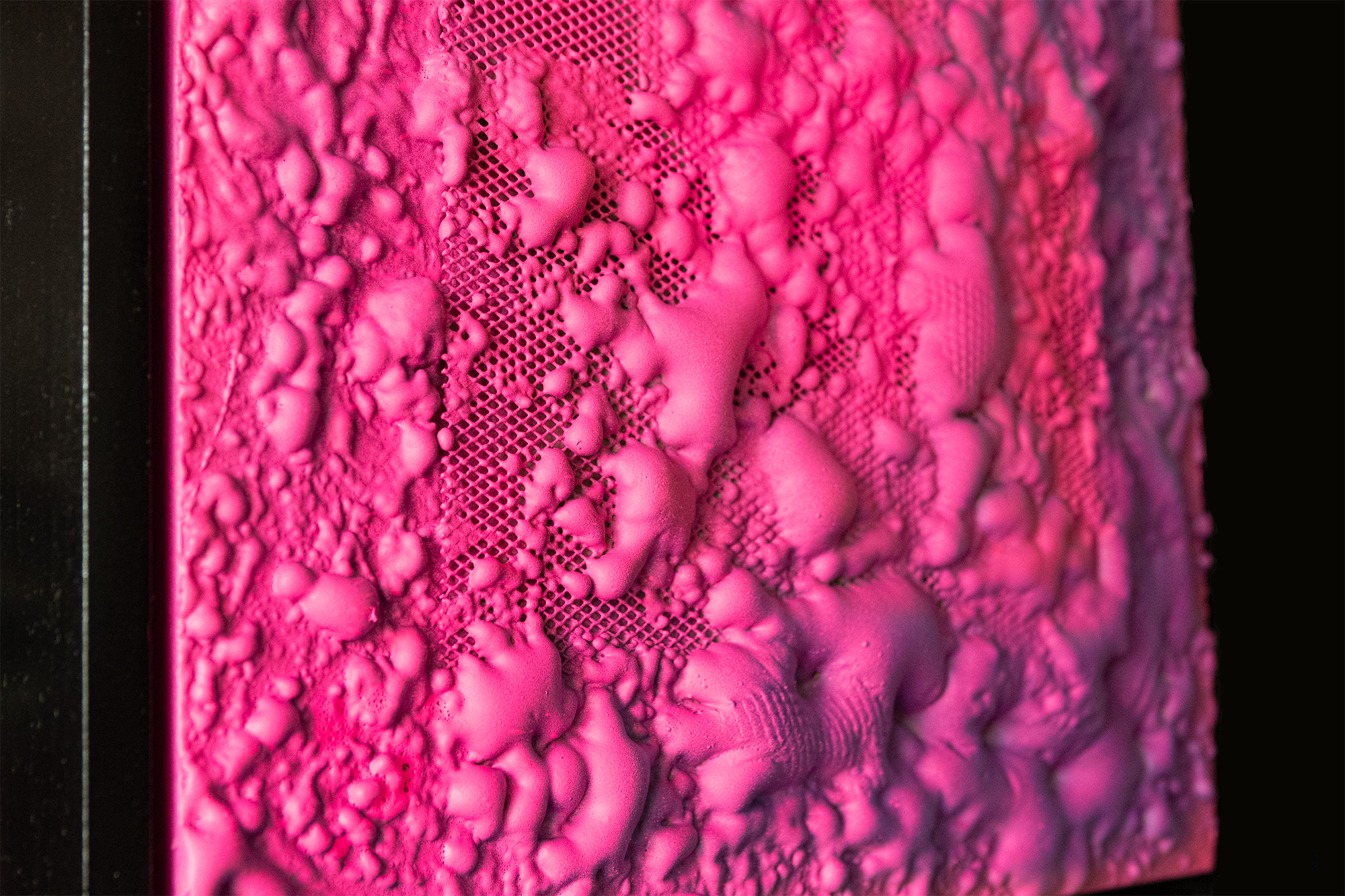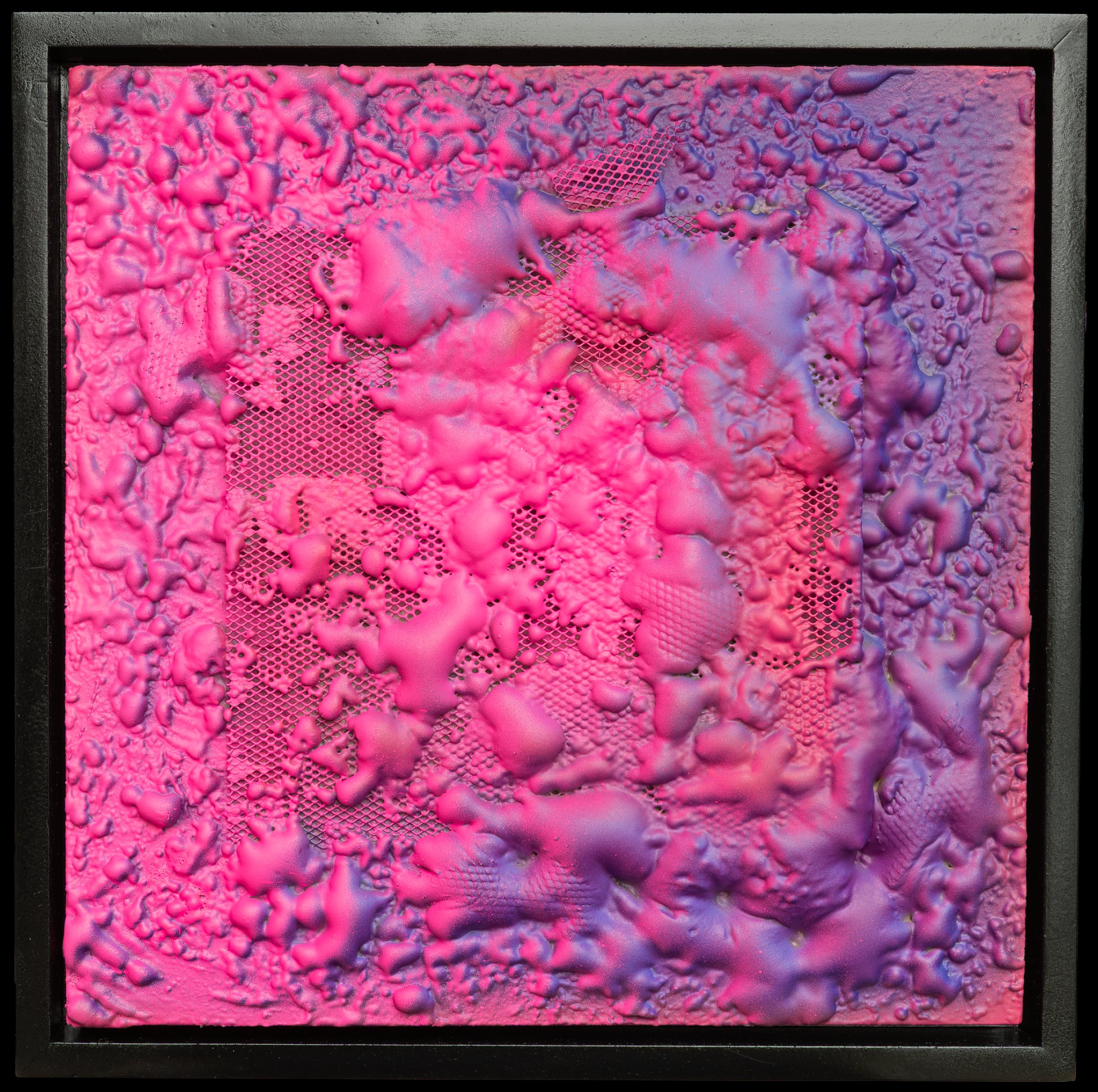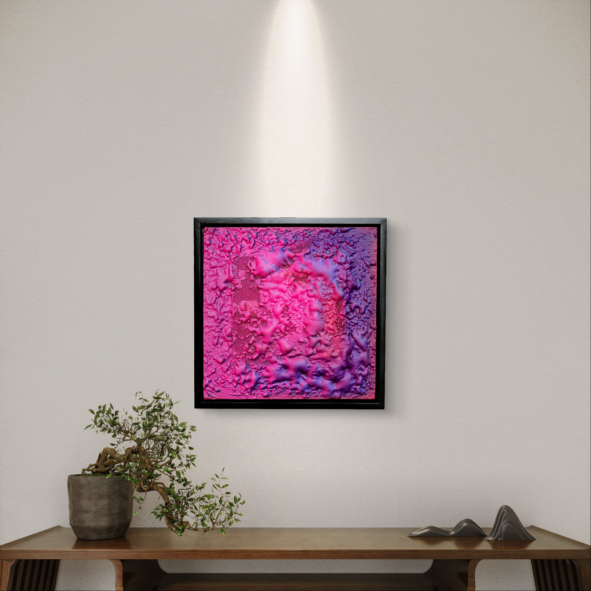 Description: Soft Armor explores the contradiction between fragility and defence. Layers of textured, cloud-like pinks and purples drift over a foundation of rigid metal mesh—half concealed, half revealed. The metal grid, once a symbol of structure and resilience, is softened by the velvety surface, almost as if memory and emotion are reclaiming the material. This painting challenges the boundary between protection and vulnerability—suggesting that even metal can be masked by tenderness, and that beneath every delicate surface lies something unbreakable.