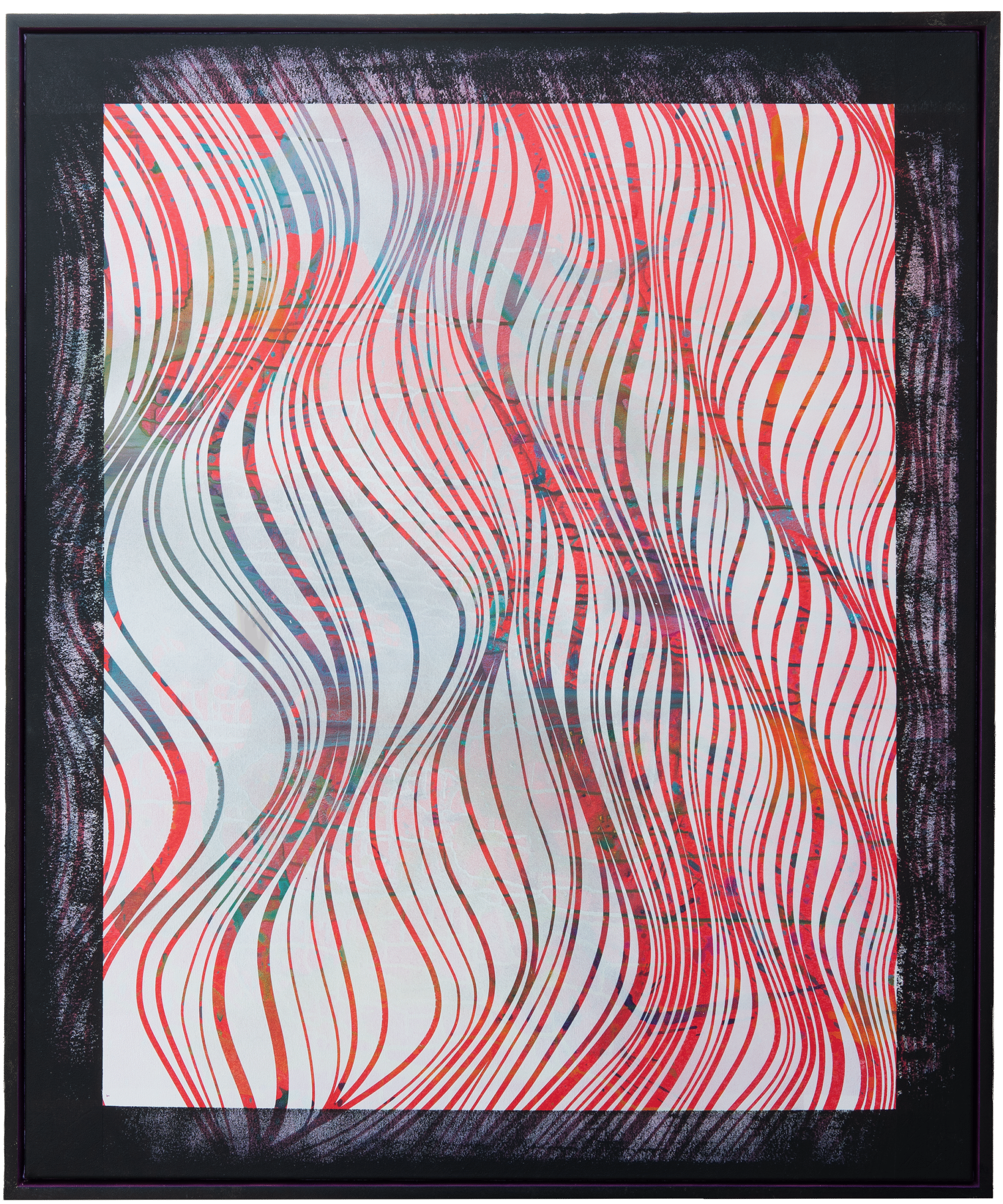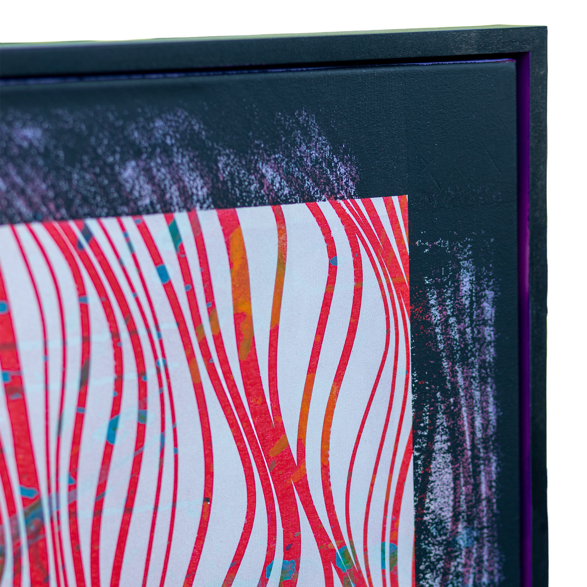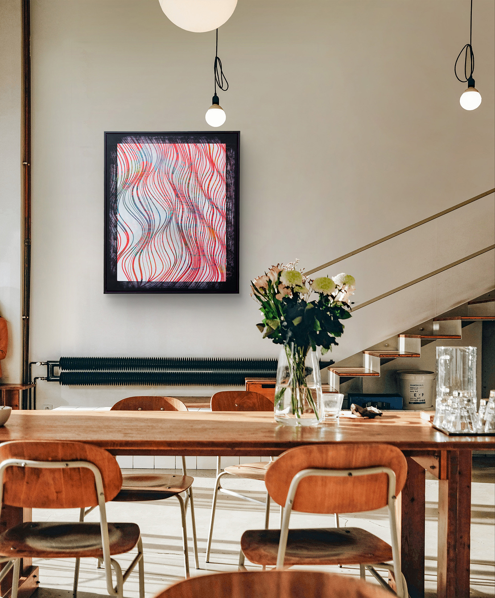 Is a hypnotic play of rhythm and flow — a visual echo of sound, movement, or emotion caught in motion. Thin, undulating red and black lines ripple across a pale backdrop, like radio frequencies dancing on air or the slow pulse of energy through space. Within the flowing lines, glimpses of fragmented colours — like digital noise or coded interruptions — add depth and hidden complexity.